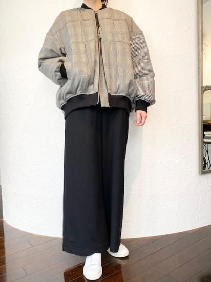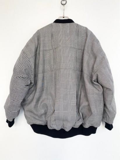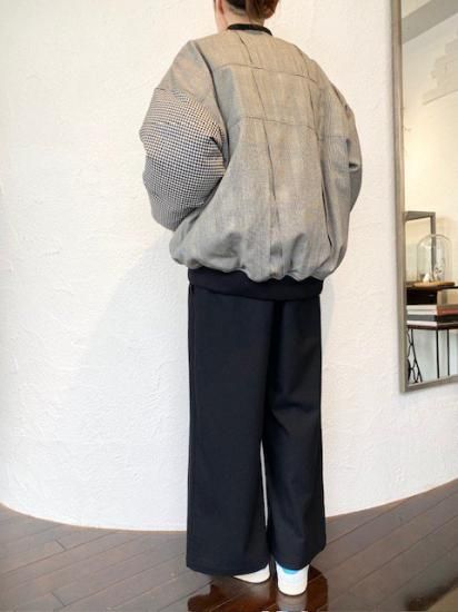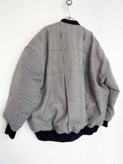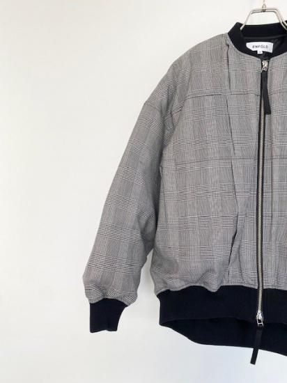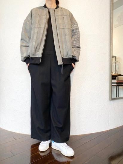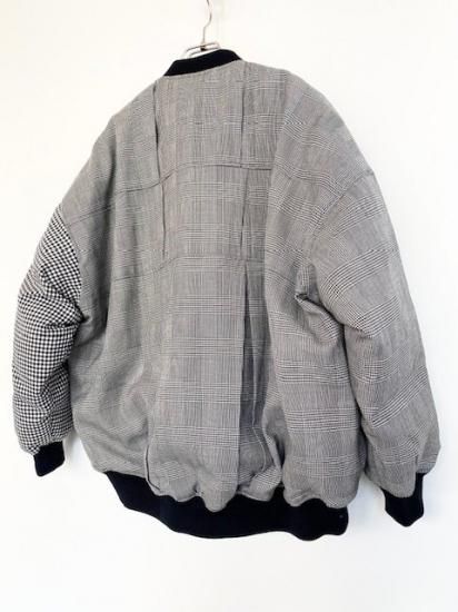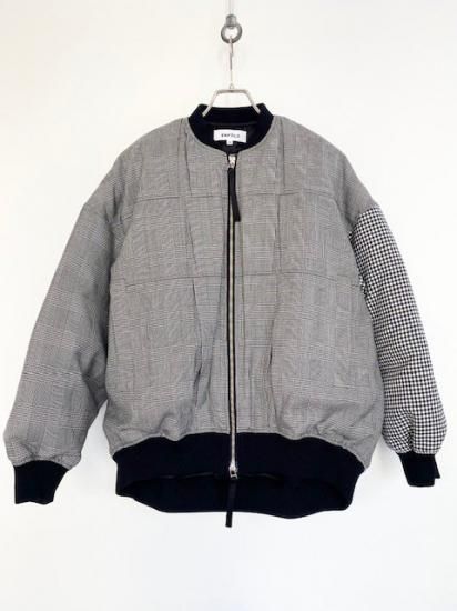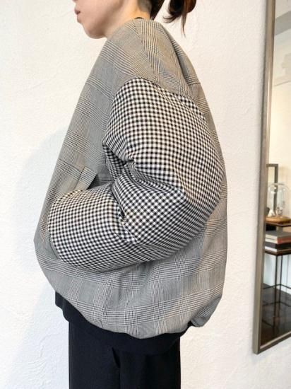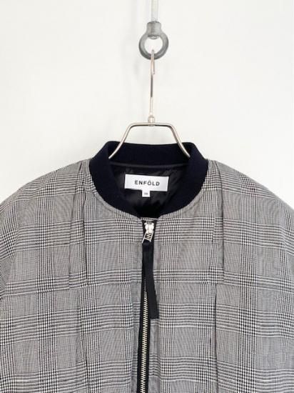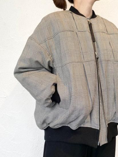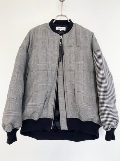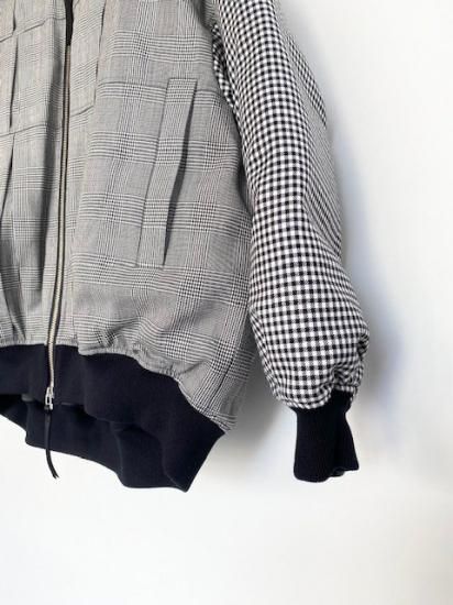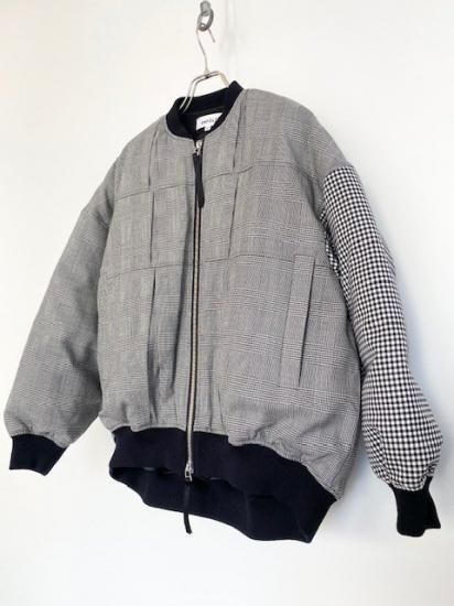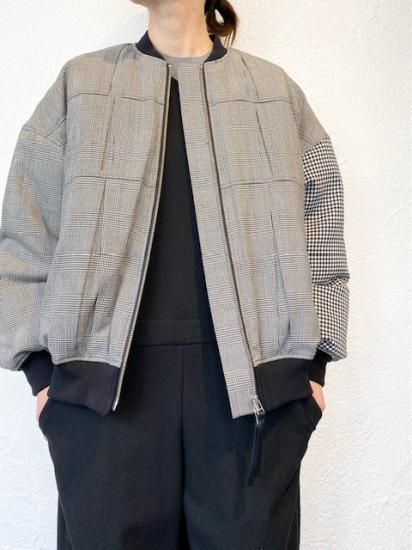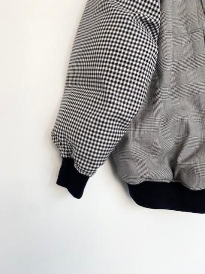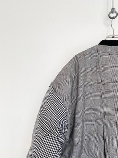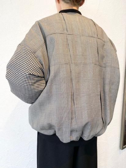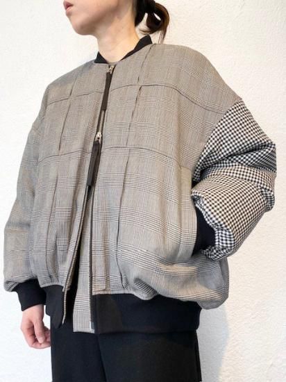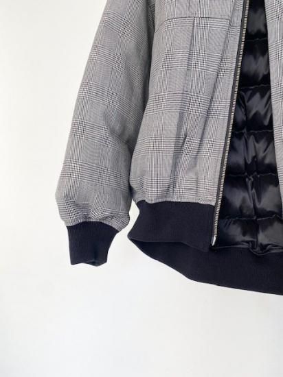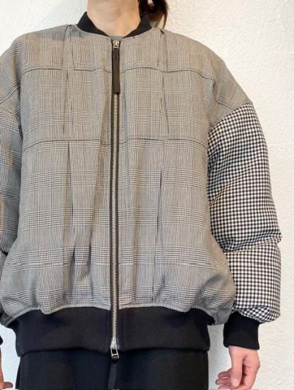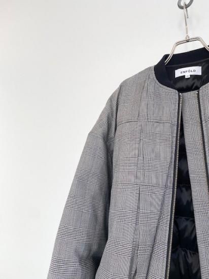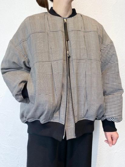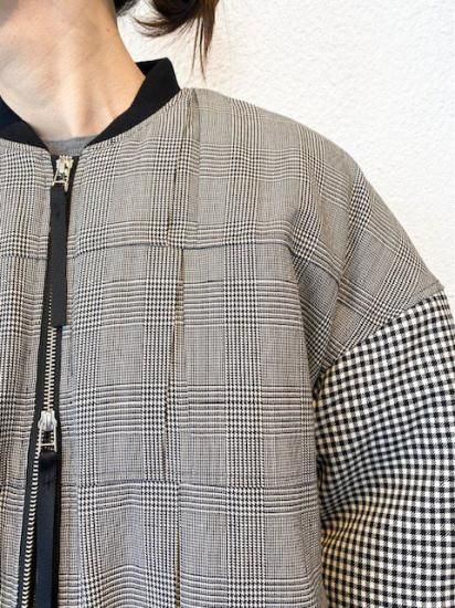 ・表地はウールの布帛、表側にパッキングが出ない仕様のダウンジャケット・二種のウールチェック生地のを組み合わせ、首回り・袖口・裾口は黒のリブ仕様のブルゾン型