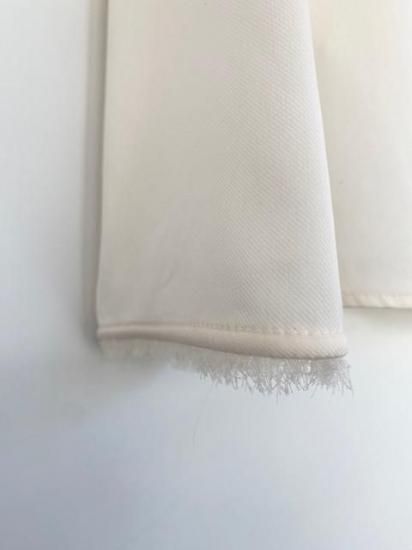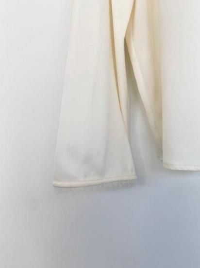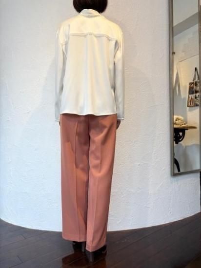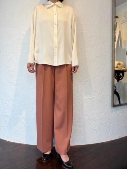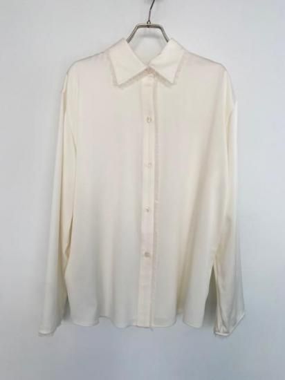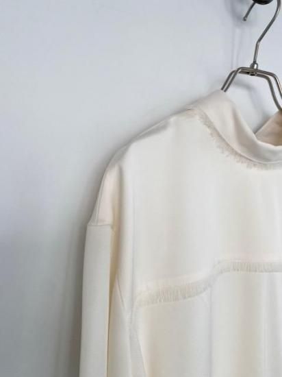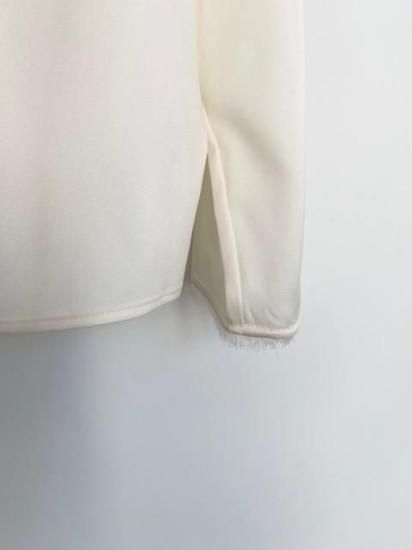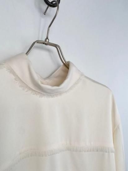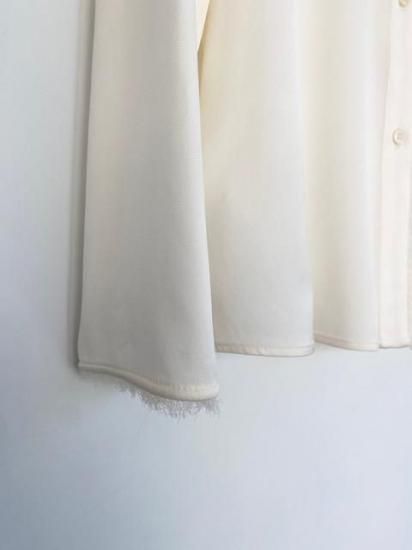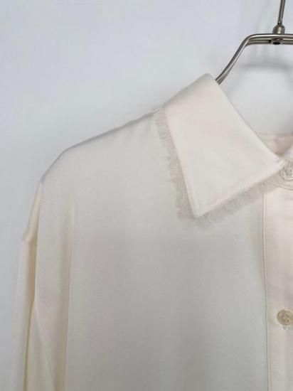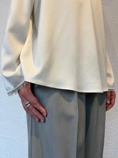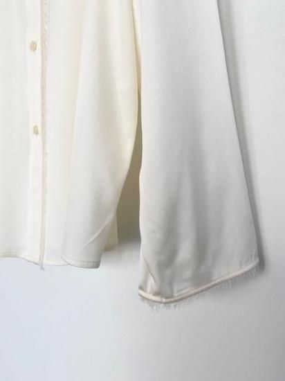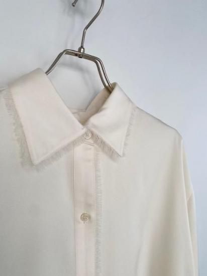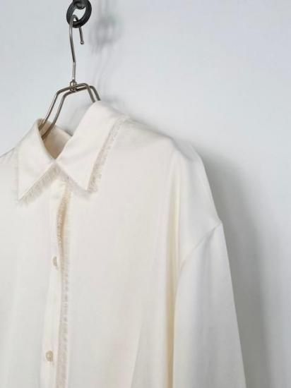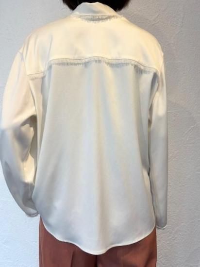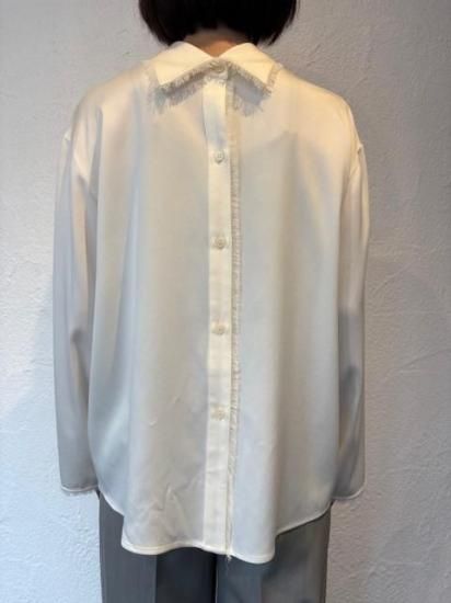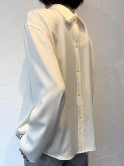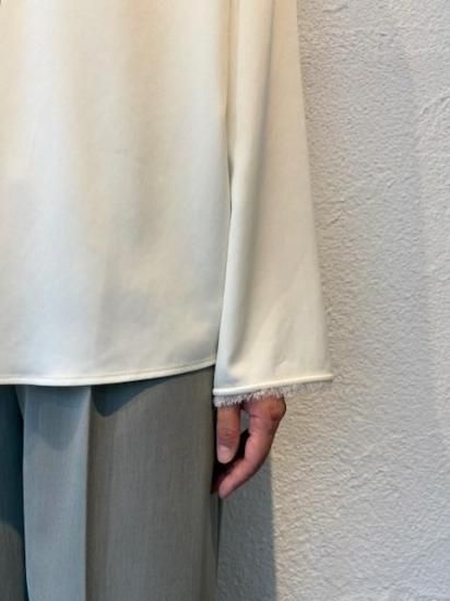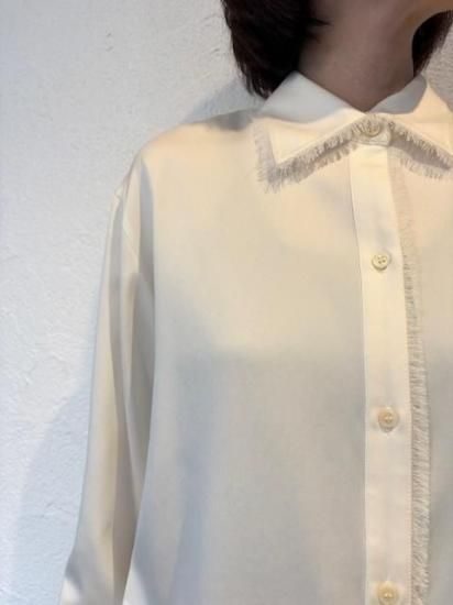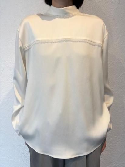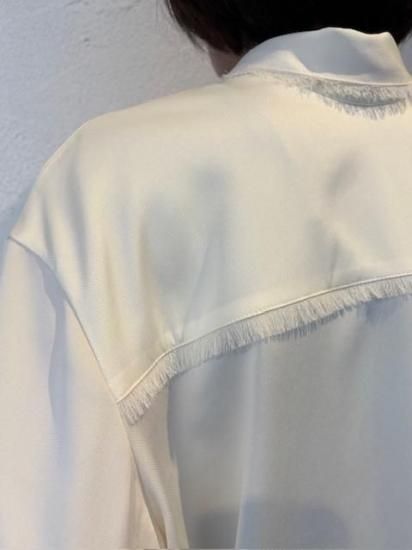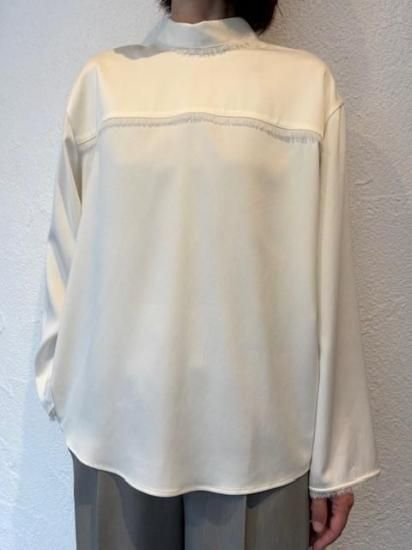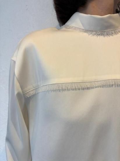 シャツカラーとスタンドカラーの2 Wayで、着用可能のデザインとなったアセテートベースのブラウスです。アセテートのシルキーな艶に、襟・袖口・ヨークにフリンジをあしらい、オリジナリティを付加しています。