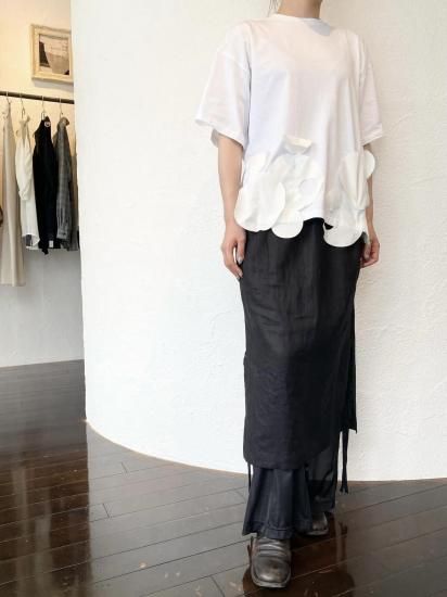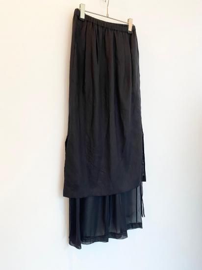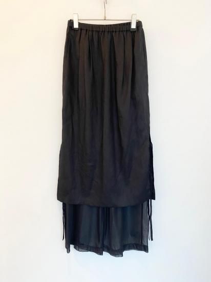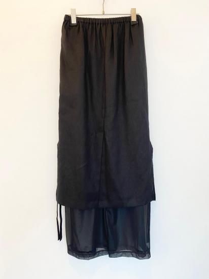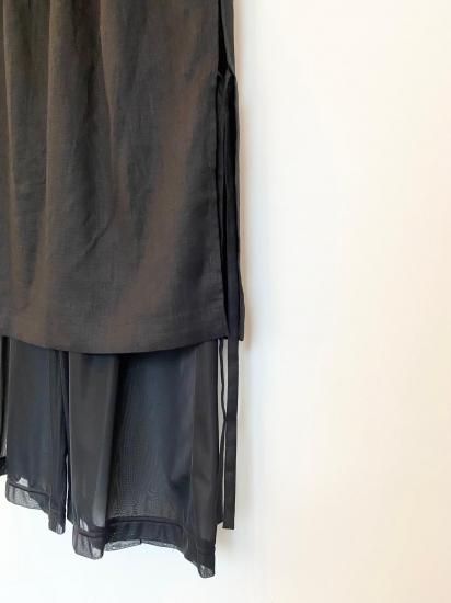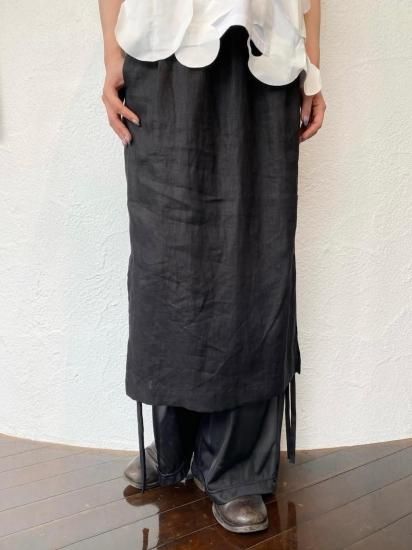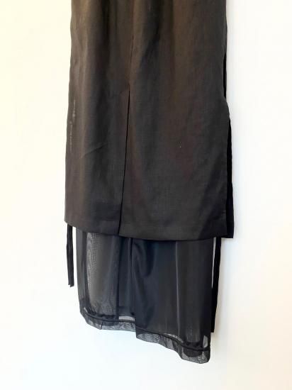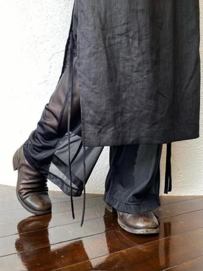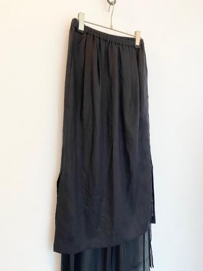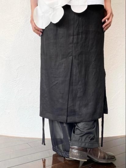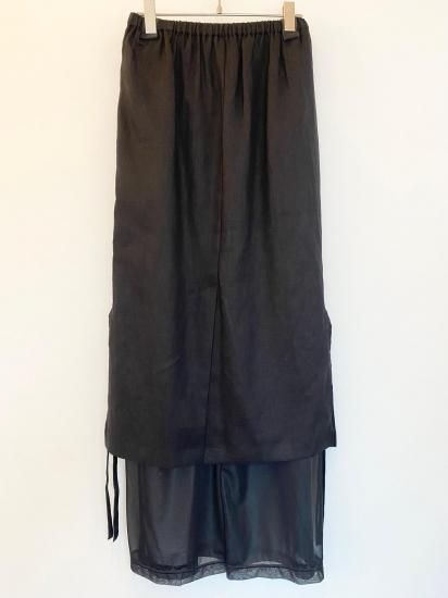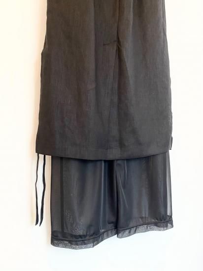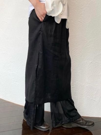 リネンと涼感のあるトリコットの今までにない素材を使用したレイヤードデザインボトムス。インナーのパンツはとろみのあるテクスチャーで、ハリのあるリネンとの相性抜群のコンビネーション。