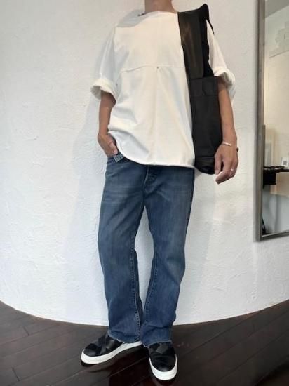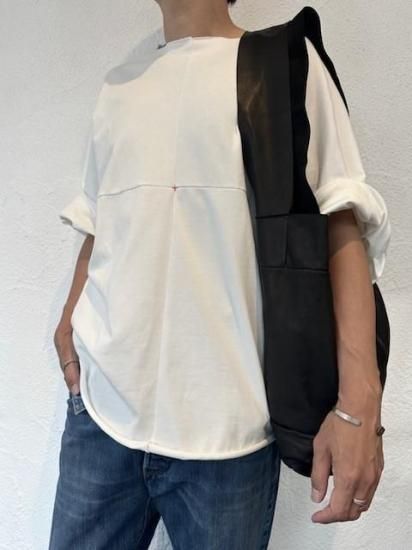 ・m.a+らしいテクニックでつくられたワンサイズ展開のオーバーTシャツ・反物の幅の限度を利用して、肩山、脇線、後ろ身頃上半分にシームがないパターンを成立