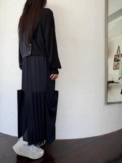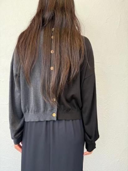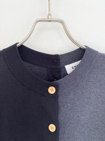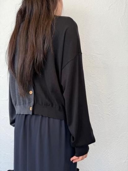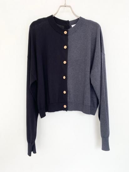 大胆に身頃が縦に真っ二つのバイカラーカーディガン。ウッドボタンを全て外すと身頃が左右に分かれます。