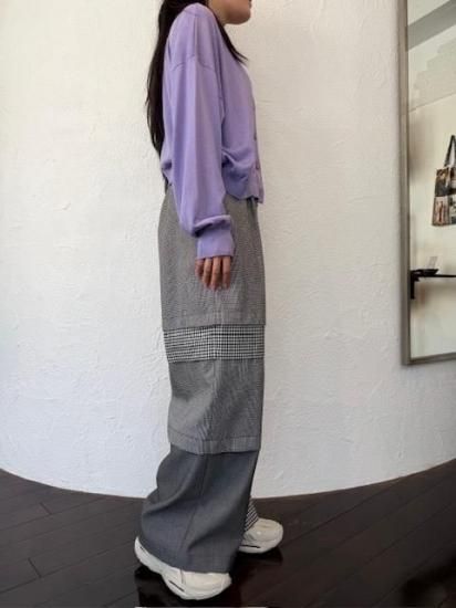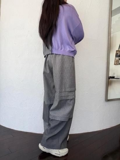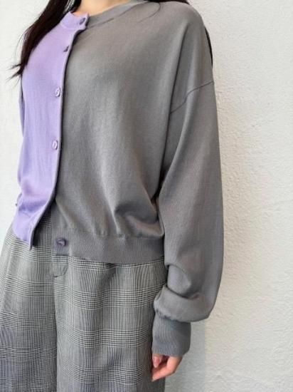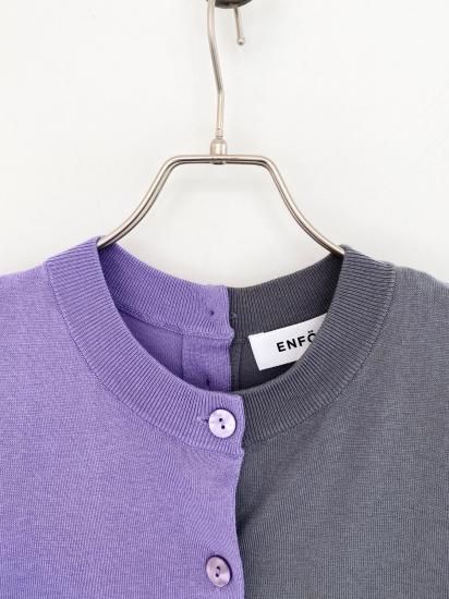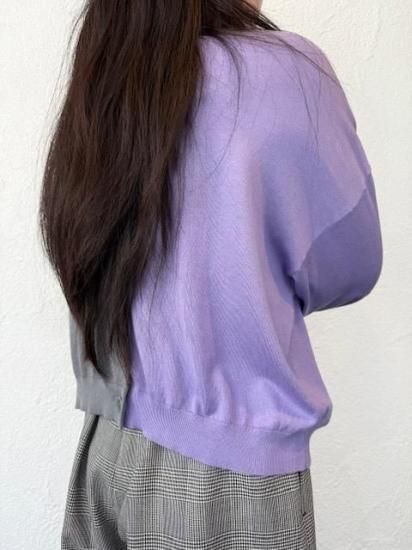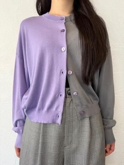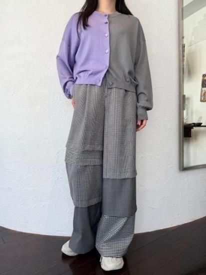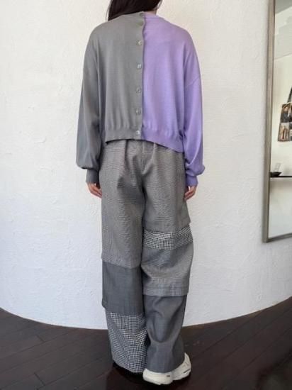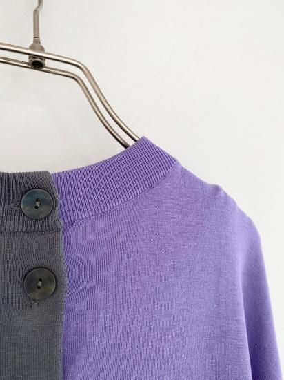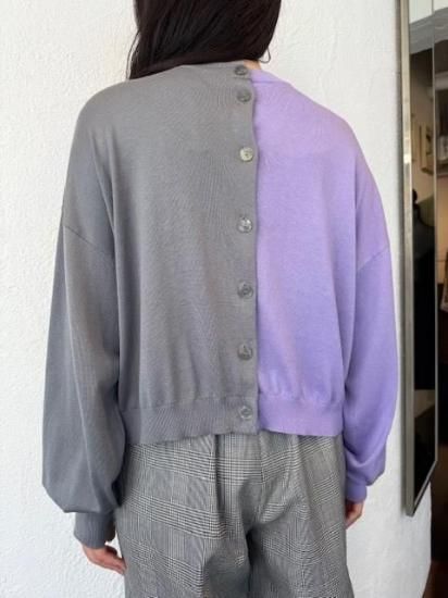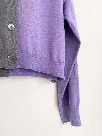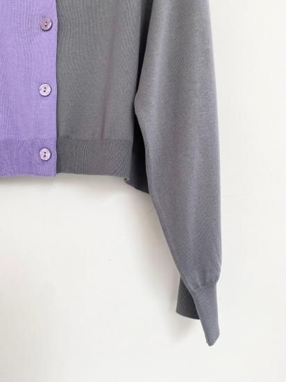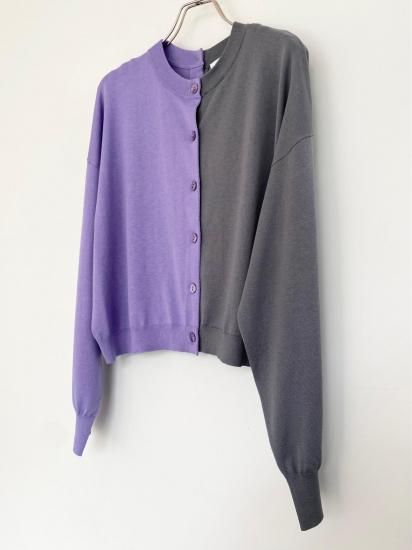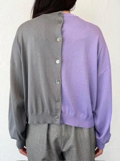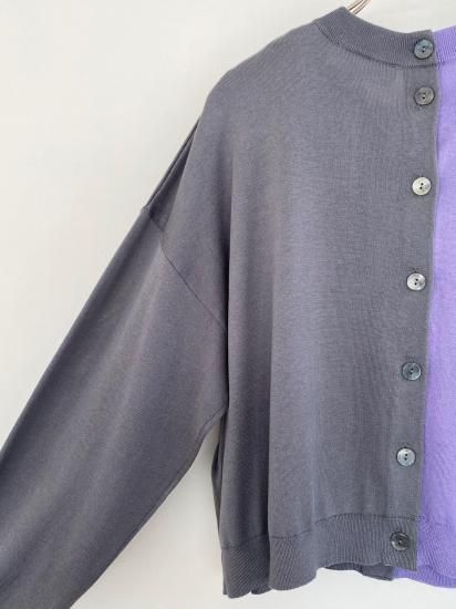 大胆に身頃が縦に真っ二つのバイカラーカーディガン。マーブルボタンを全て外すと身頃が左右に分かれます。