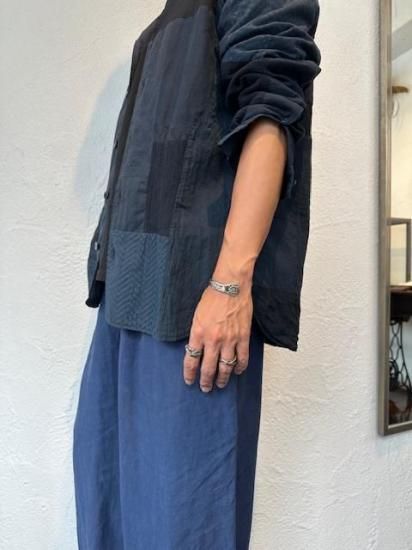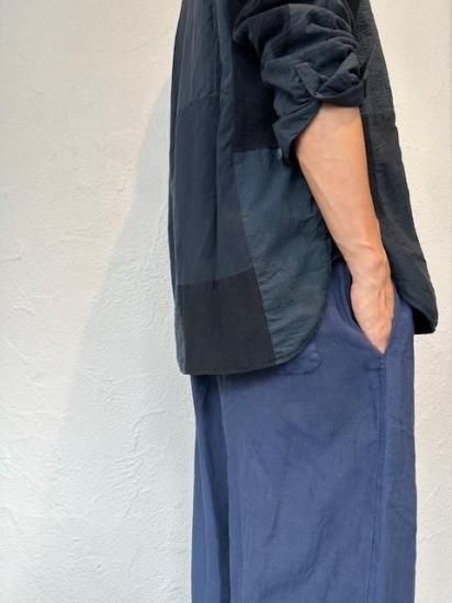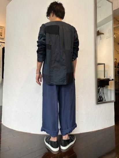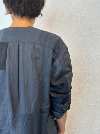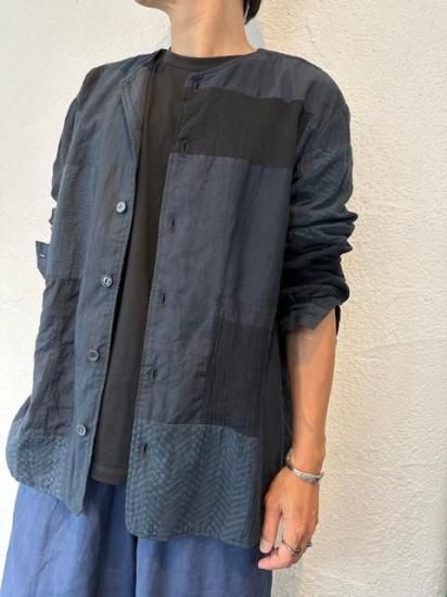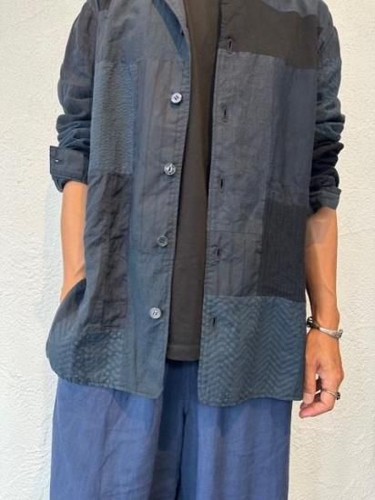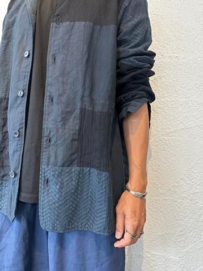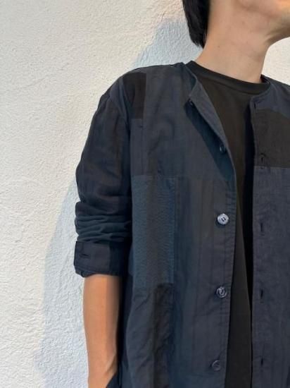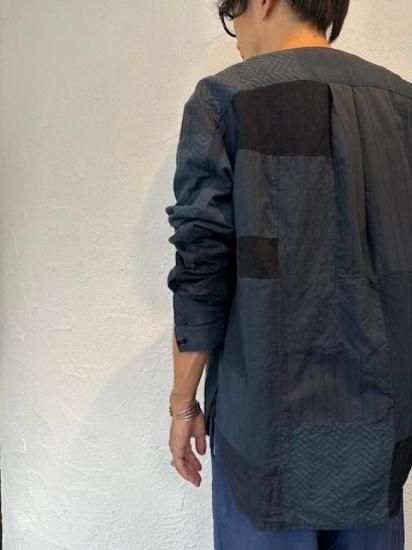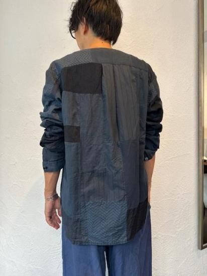 ・複数の生地をパッチワーク仕立てしたスペシャルなノーカラーシャツ・裁断・縫製・染色・仕上げの全てがデザイナーのアトリエで行われている