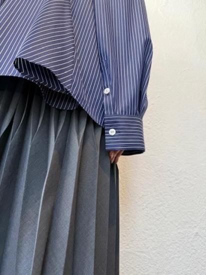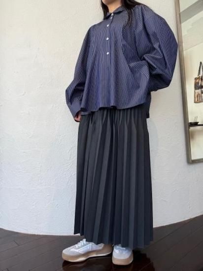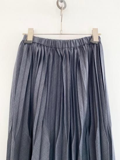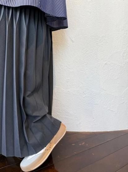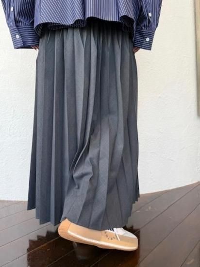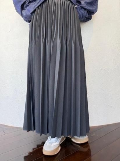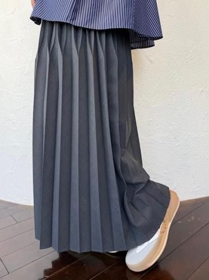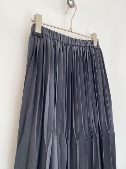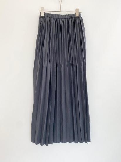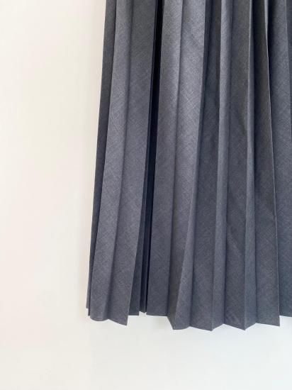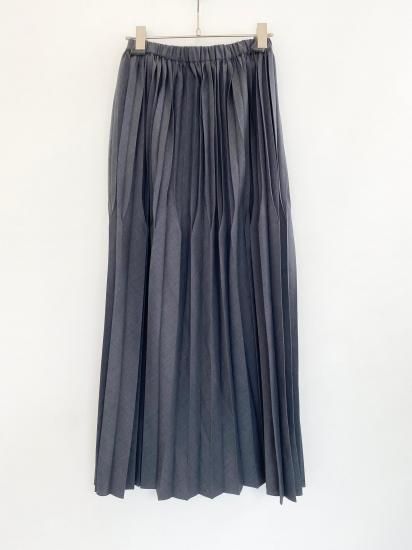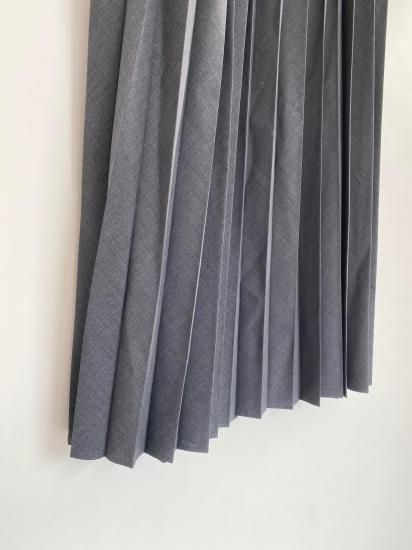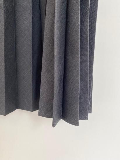 ポリエステルとウールの少ししっかりした素材を、マニアックなプリーツの手法でデザインしたスカート。実際、上部はヒダが谷折り・真ん中より山折りの2種のプリーツになっています。