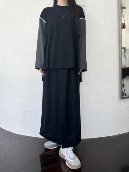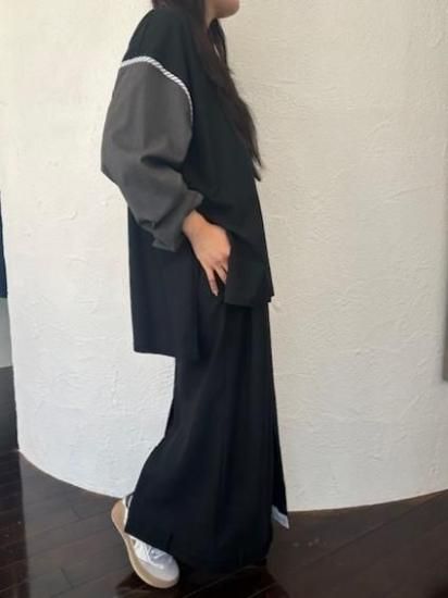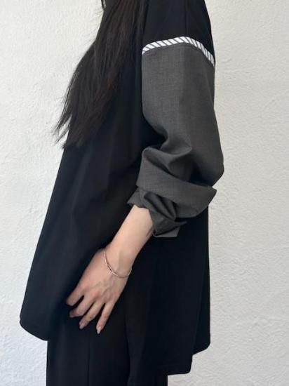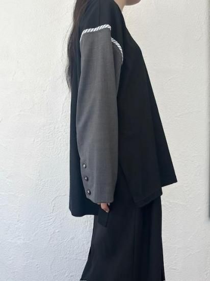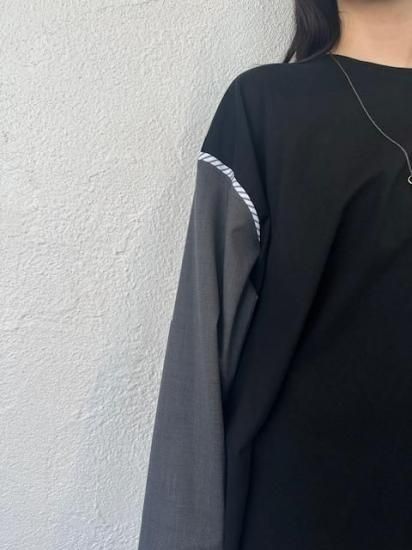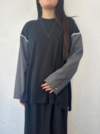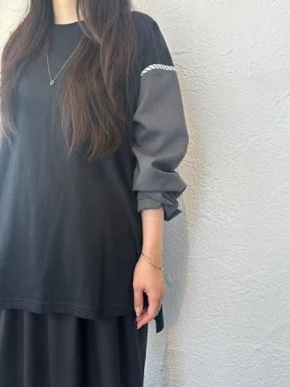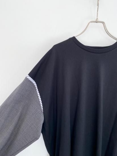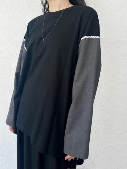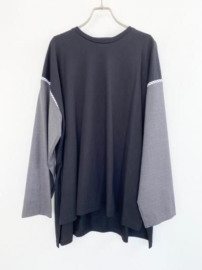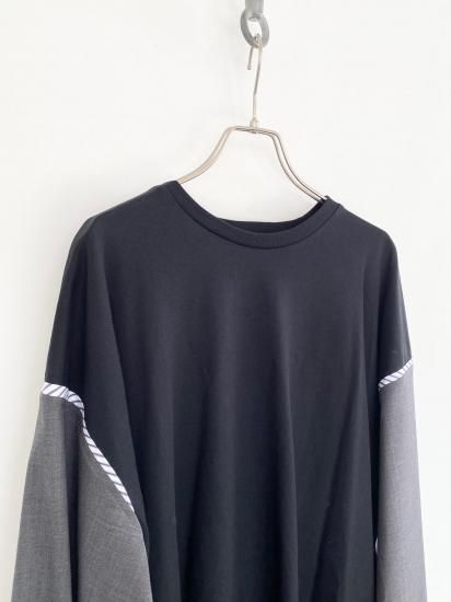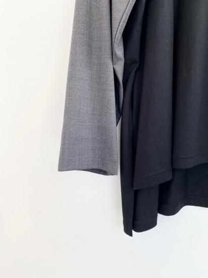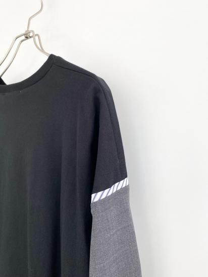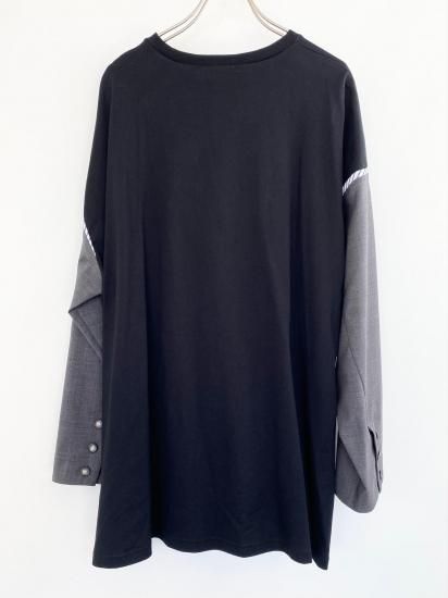 ジャケットスリーブとTシャツのドッキングアイテムです。袖にはスーツ地を使用し、袖山にスーツの裏地をイメージしたパーツを挟み込んでいて、シンプルに合わせられるアイテムでありながら遊び心が詰まった一点。