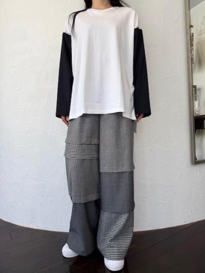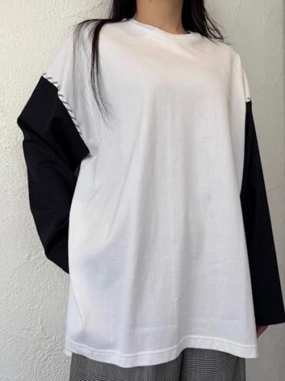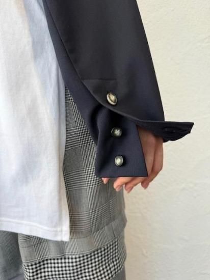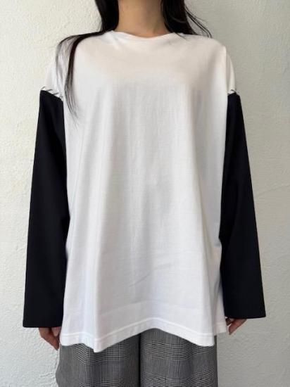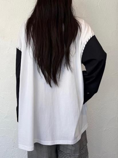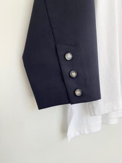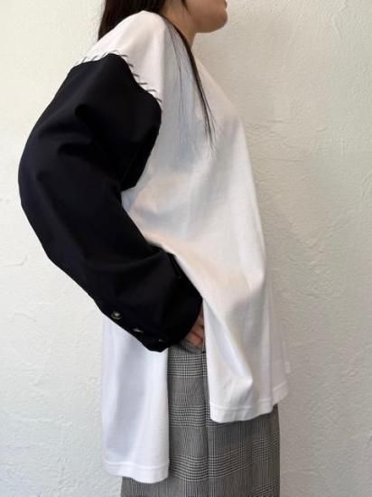 ジャケットスリーブとTシャツのドッキングアイテムです。袖にはスーツ地を使用し、袖山にスーツの裏地をイメージしたパーツを挟み込んでいて、シンプルに合わせられるアイテムでありながら遊び心が詰まった一点。