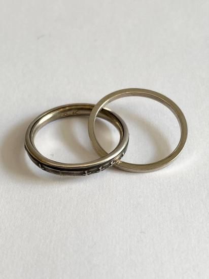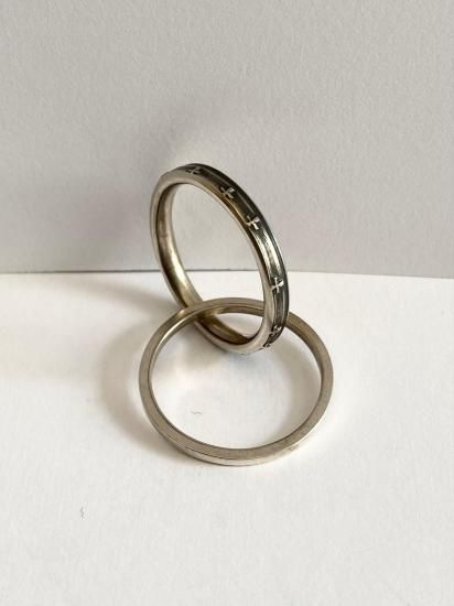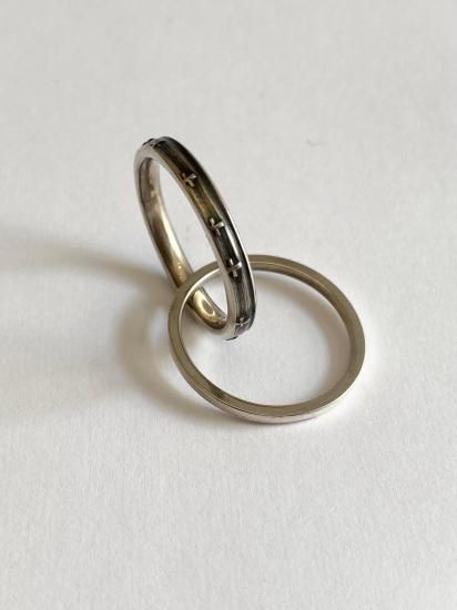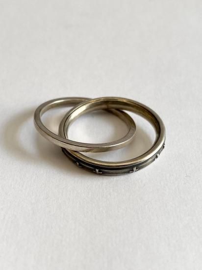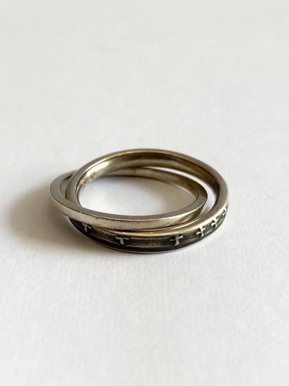 ・+の彫りが入ったリングと平打ちのリングが繋がった2連リング・隣の指に分けて一本ずつリングをつけることも可能で多様なつけ方が可能