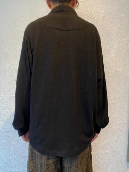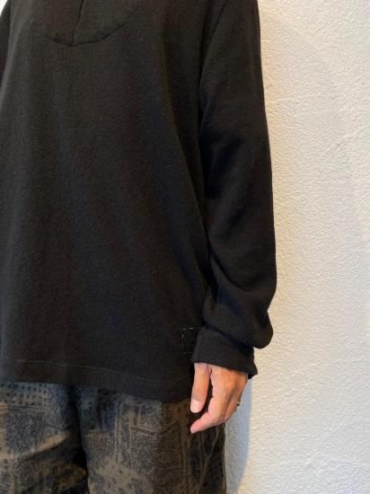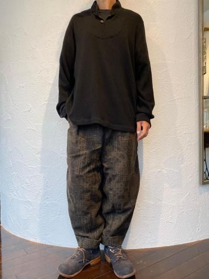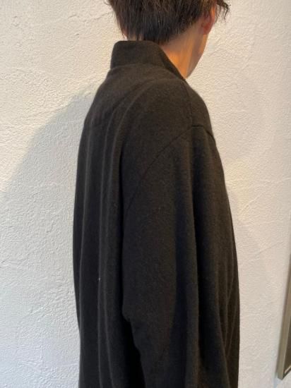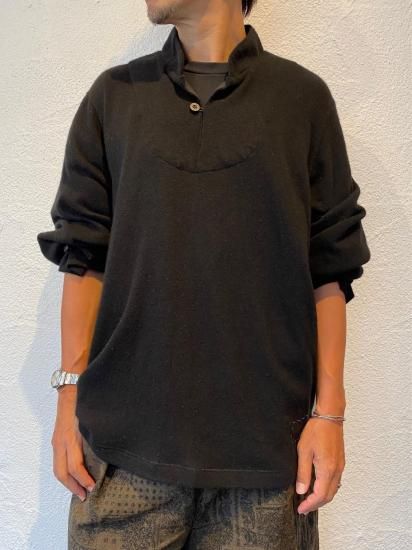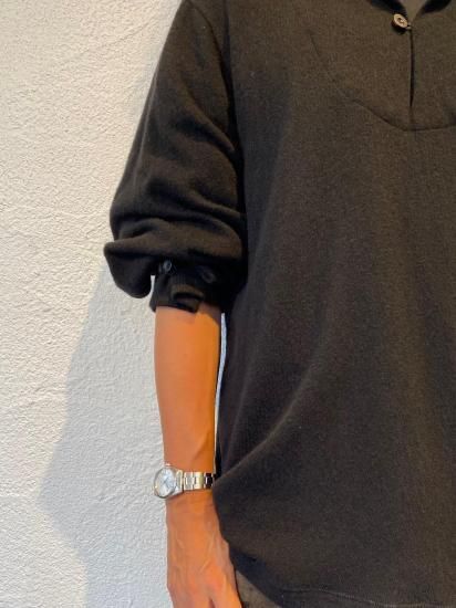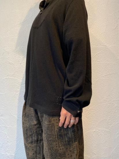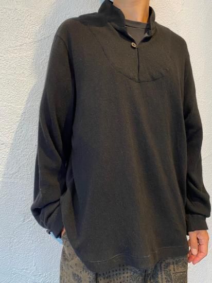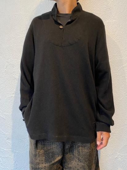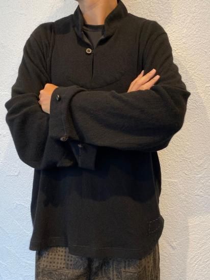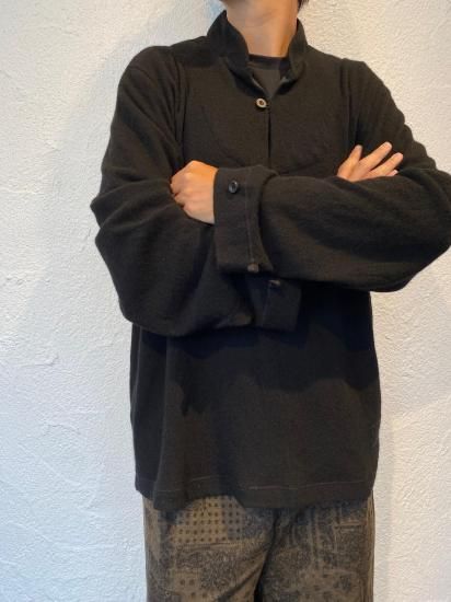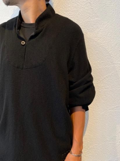 ・スタンドネックひとつボタンのプールオーバー・首回り裏をコットンリネンで丸く裏地張りし、上品なラウンドデザインとなっている