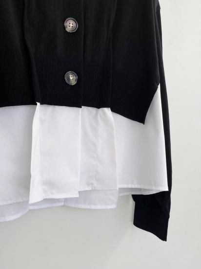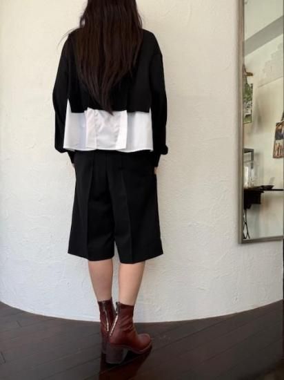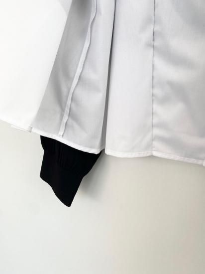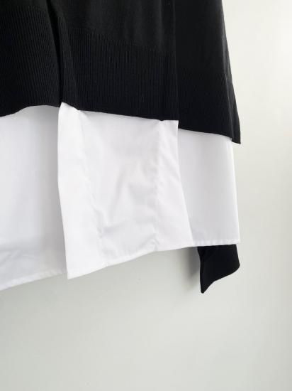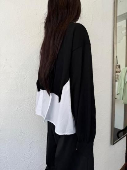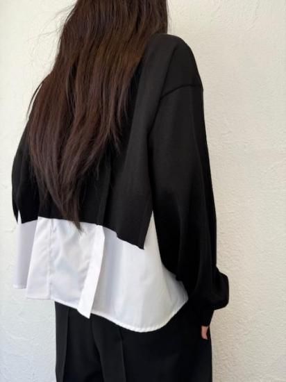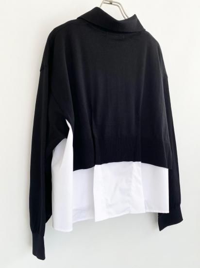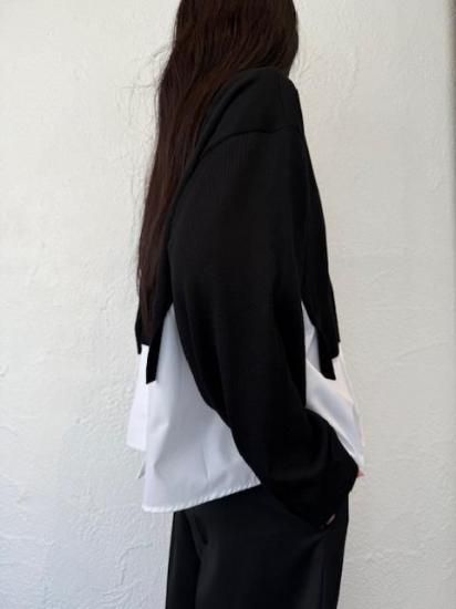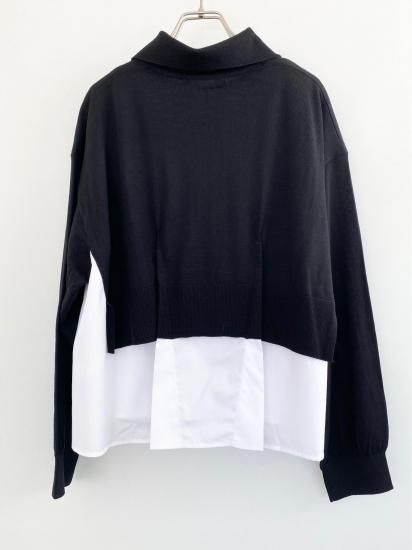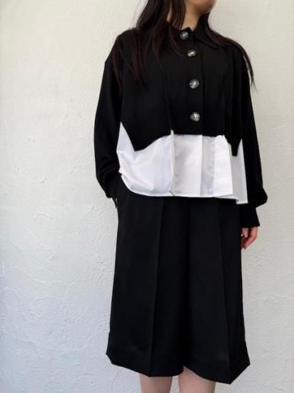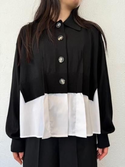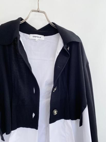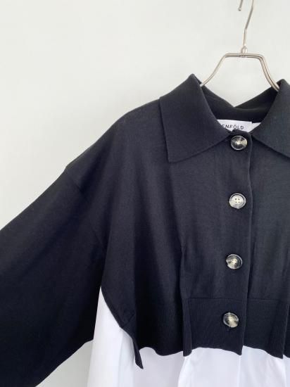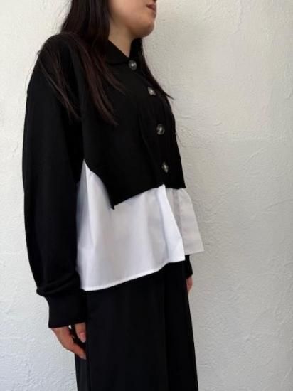 白シャツに襟付きショートカーディガンを羽織っているスタイルが一枚で完成するドッキングアイテムです。