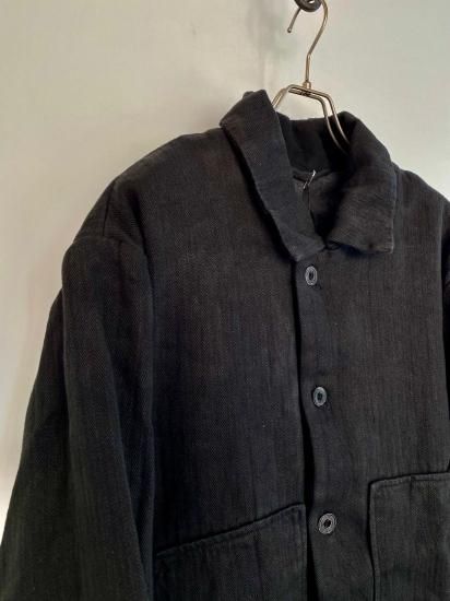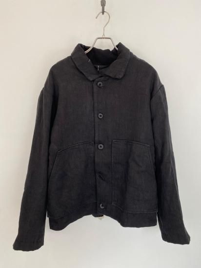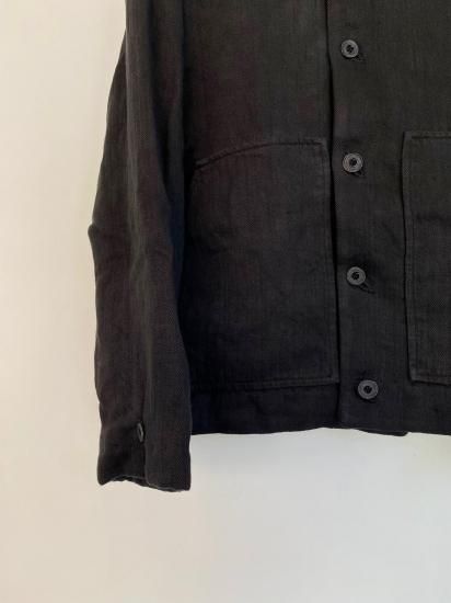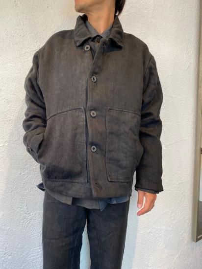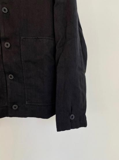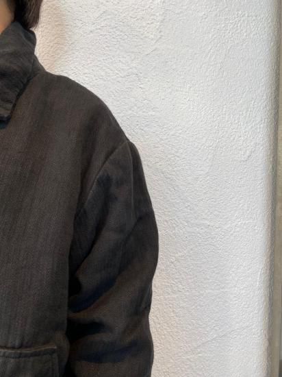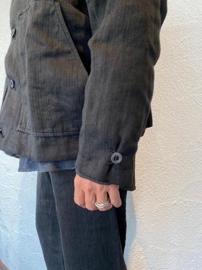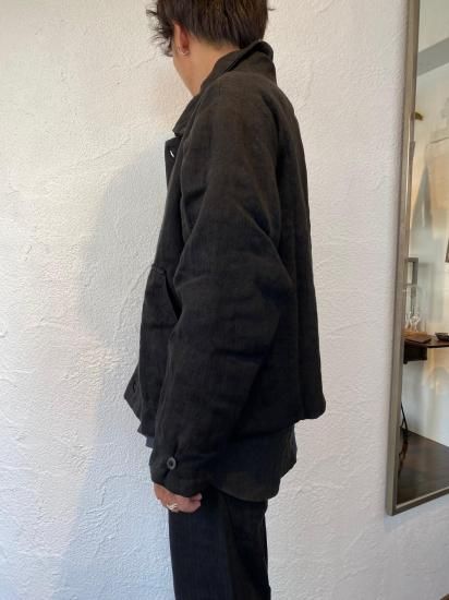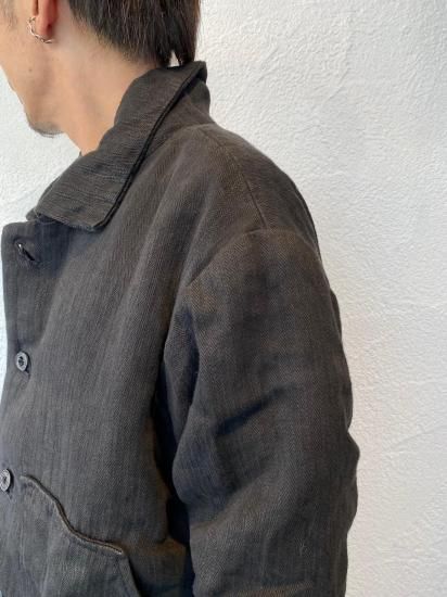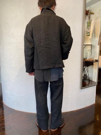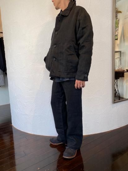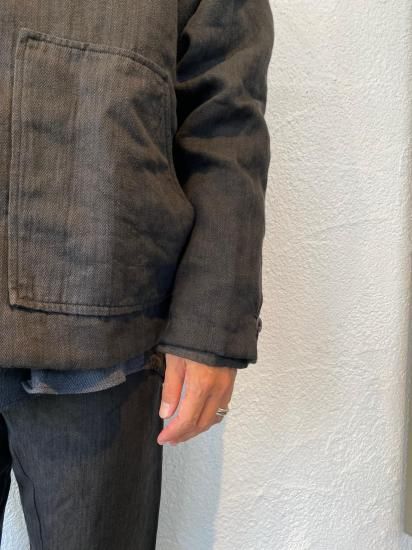 程よく肩をドロップし、アームホールのかまを広く取りながら着丈は短くすることで、リラックスながらもコンパクトなシルエットが特徴的なブルゾンです。ベースはLinenのヘリンボーンを使用したものをアトリエで手染めで仕上げており、所々の生地のムラがヘリンボーン生地の良さを際立たせてくれます。