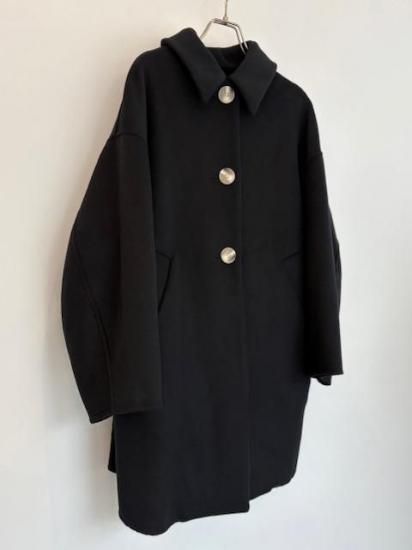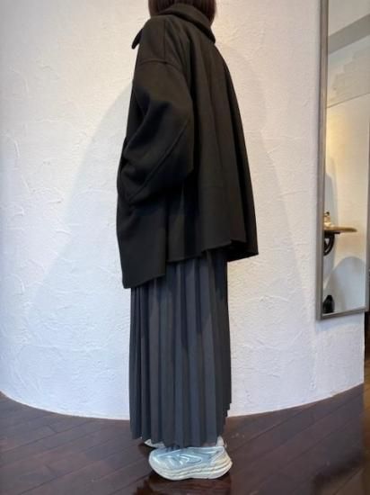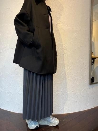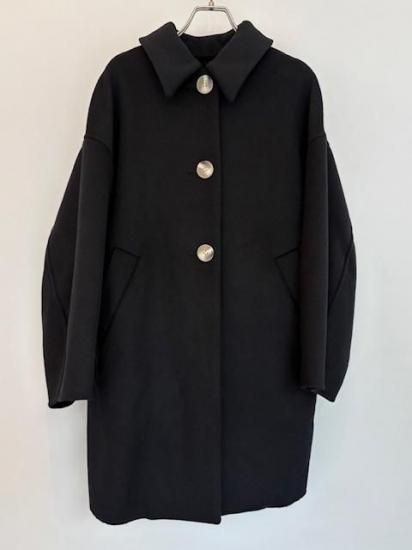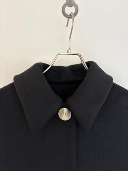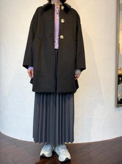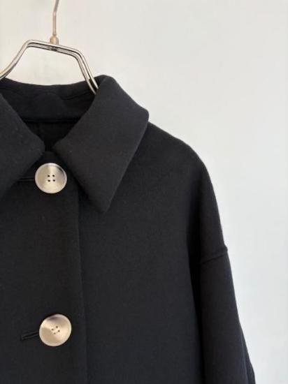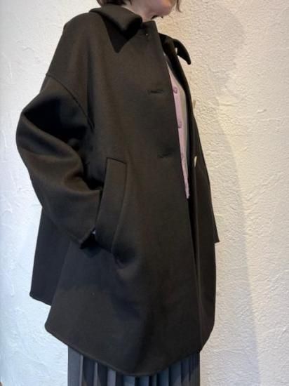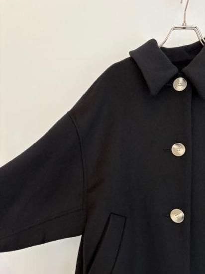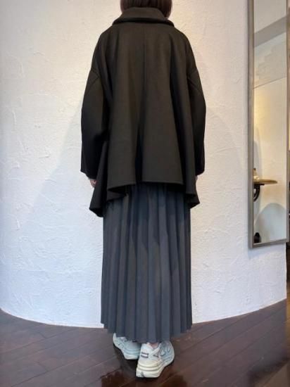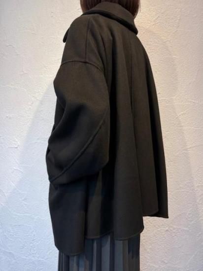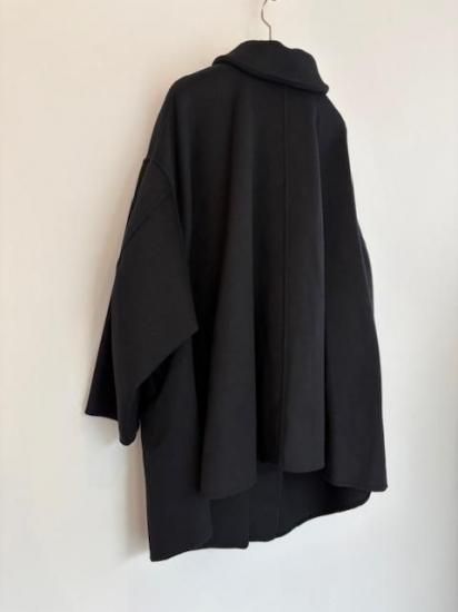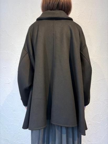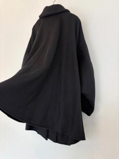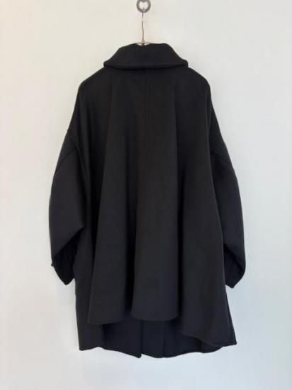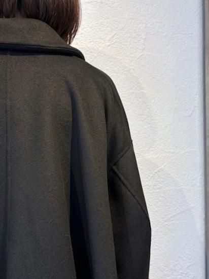 前面はスタンダードなステンカラーのクラシックなデザインのコートでありながら、アームを非常に大きくとり、背面は、ポンチョの様なドレープの出るパターンとなっており二面性を感じるデザインです。