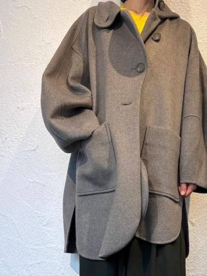 切替を利用した丸みのある立体的な袖や前あきや裾のアシンメトリーなサークルカッティングなど、