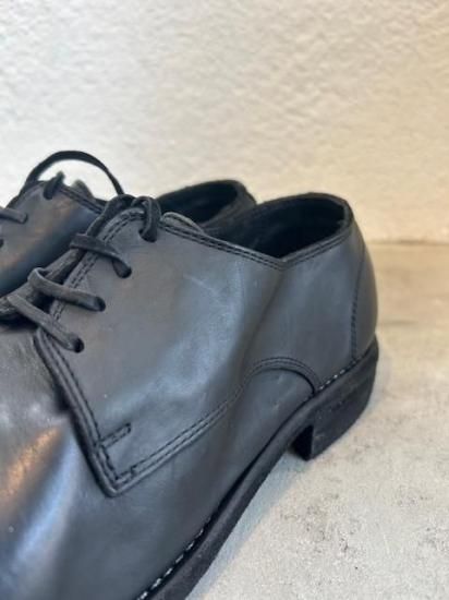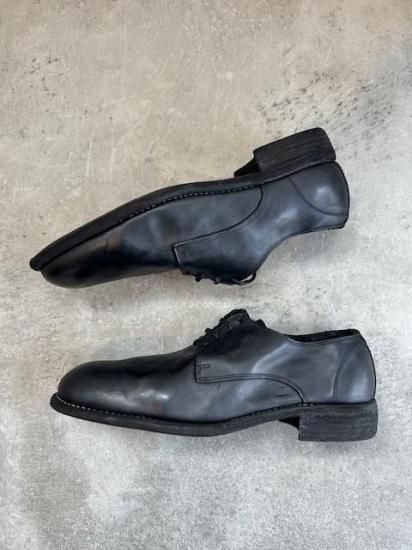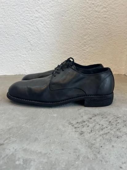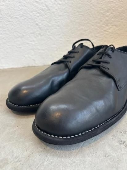 GUIDIの約130年に及ぶ熟練の技術で鞣され、タンブラーダイし製作された本品はシボが少なく艶のある仕上がりとなっており、足入れした際にアッパーに履き主独自のドレープを革が形成し、足が守られているかの様な実感で着用していただくことができます。グットイヤーウェルト製法のダービーシューズです。GUIDI(グイディ)
