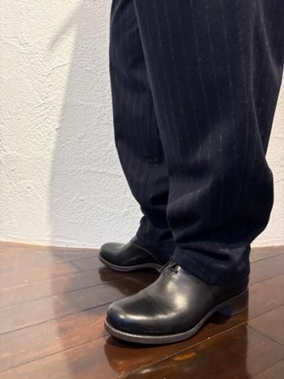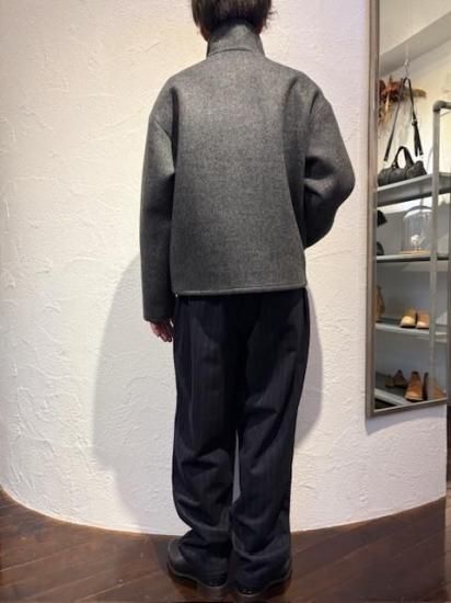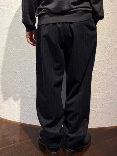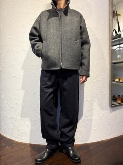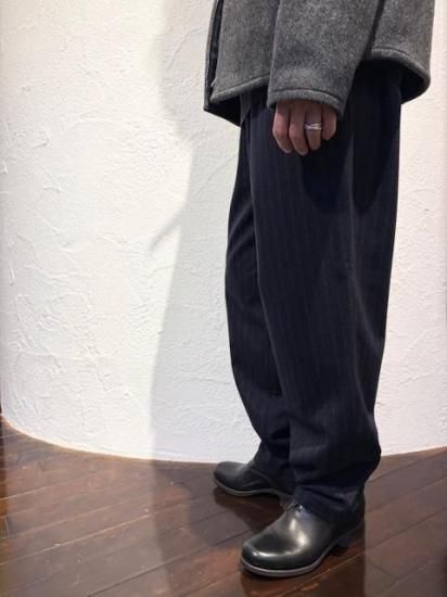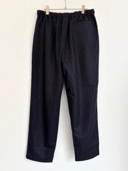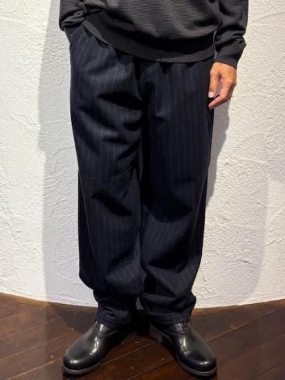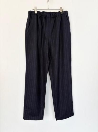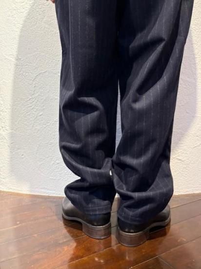 ・ノータックステーパードイージートラウザー・生地はフェルトに近い厚みのあるフランネルウールで、ネイビー地にかすれストライプの冬素材