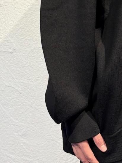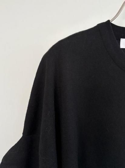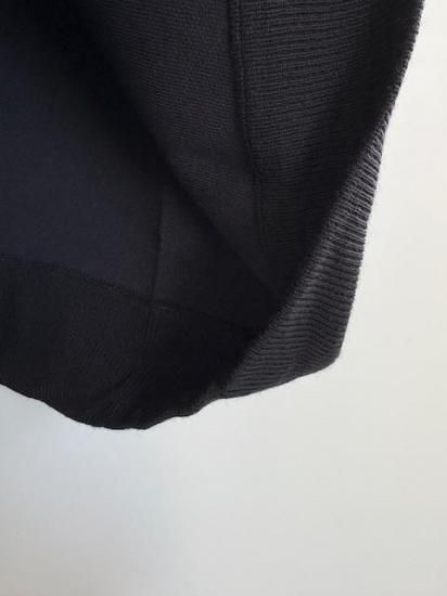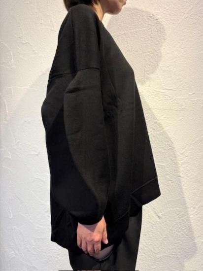 表と裏で編みの組織を変えて編んだダブルフェイスニット、着た時の感じ方はスウェットの様にも感じ、その着心地はとても軽いラウンドネックです。実際、裏糸がポリエステルの糸で編まれており、ウールの上品な美しさを持ち合わせながら、ウール糸の重みでシルエットがくずれない様、裏糸が支える構造となっており、新技術が採用されています。