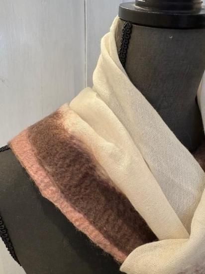 イタリアフィレンッエを拠点にヨーロッパの名だたるメゾンブランドのファブリックデザインを行っている、 ファブリックデザイナーの重鎮Silvana Manettiが初めて自身の名前で発表したストール。 自社のLABにて研究し完成したコレクションは原糸を独自の方法で合わせたフェルト状になる前の 非常に柔らかで軽く温かみのある肌触り、使って行くうちにフェルト化してゆく経年変化や一つとして同じ物ができないクラフト、ハンドメードならではの特性もお楽しみ頂きたいストール。