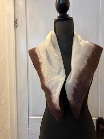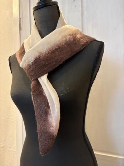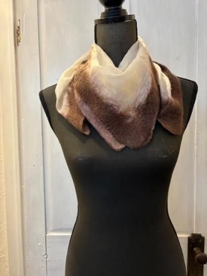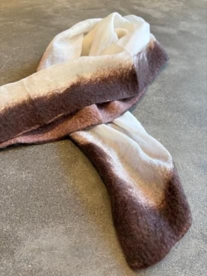 ・極細のカシミヤ糸でベースをつくり、四方の端にブラウンのカシミヤファイバーを重ね圧縮したスカーフ・製作はLABO内で行われ、ファイバー状の繊維を重ねて圧縮させることでつくられるSILVANA独自の