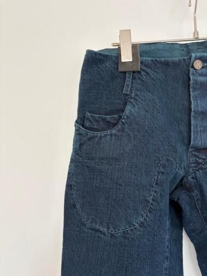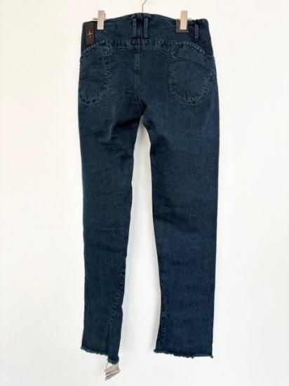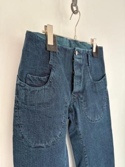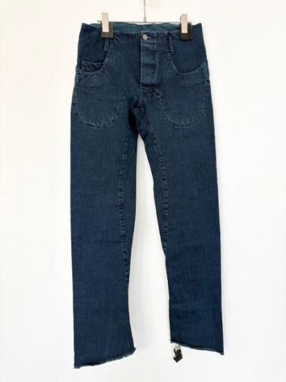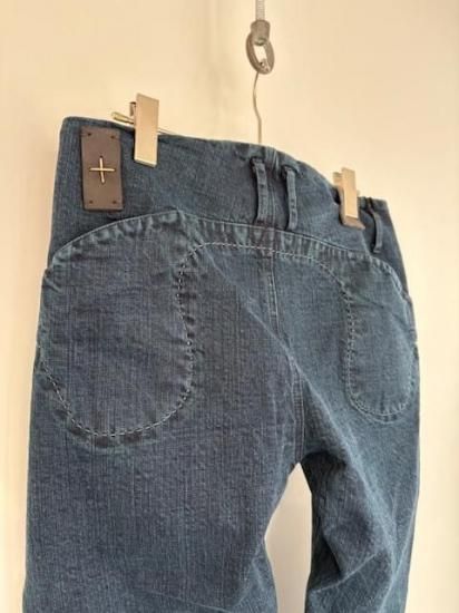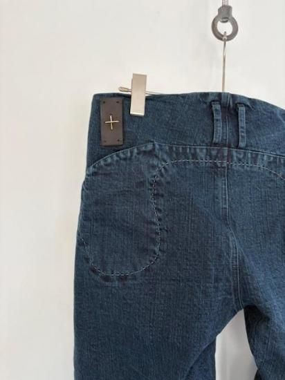 ・Denimシリーズの再販、再販版では、クロスの刻印を納めた革パッチは黒でリリースされた・股上が浅く、サイドシーム無しのm.a+ならではのパターン