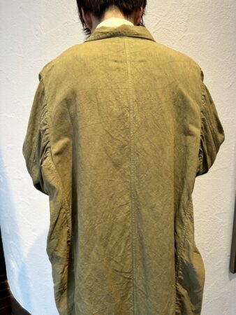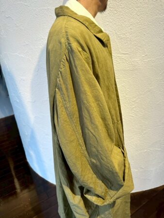 シャツと比較すると、こちらのコートの方が厚地のリネンを使用しています!固めのハリ感やオーバーダイのムラ感(白んでみえる風合い)が強く仕上がっています。