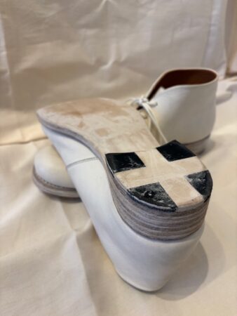 レザーソールの積み上げをハンドペインティングし、アイテムにマッチした風合いで