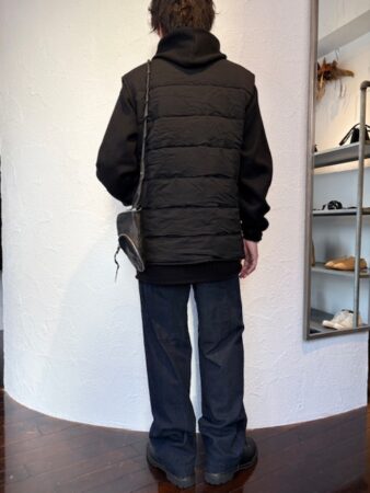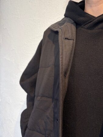 MOTHER HAND artisanのフードニットをインナーにしたスタイリングです。