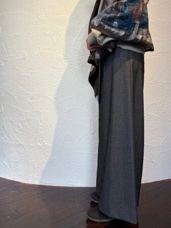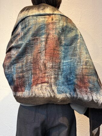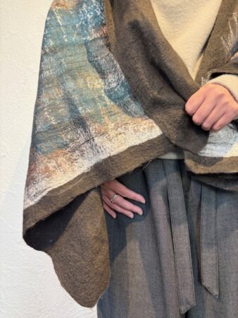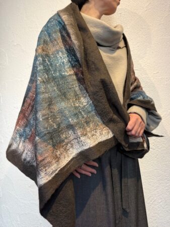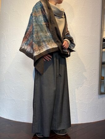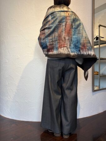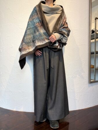 SILVANA MANETTIのストールをショールとして羽織ったスタイリング。