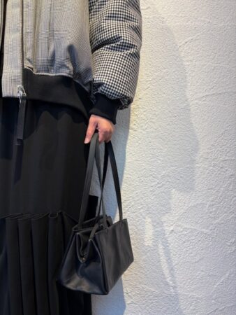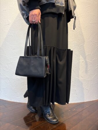 コーディネートの引き締め役にm.a+の13cm PHI Hand BagをGUIDIのブーツと合わせました。