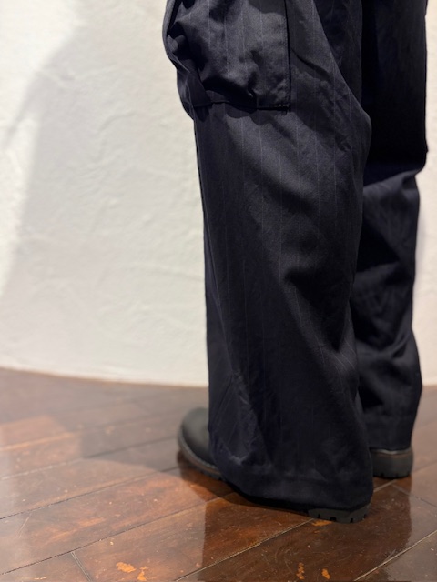BIELLA社のスーチングウール手染めのストライプ生地のカーゴトラウザーと、
