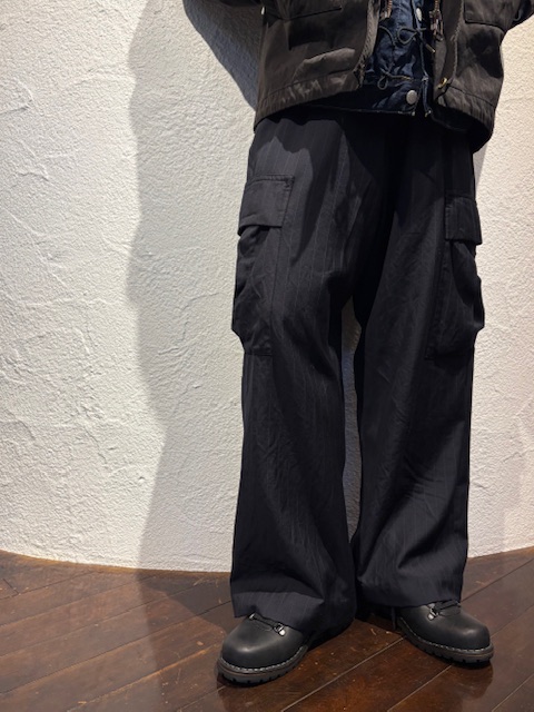 BIELLA社のスーチングウール手染めのストライプ生地のカーゴトラウザーと、